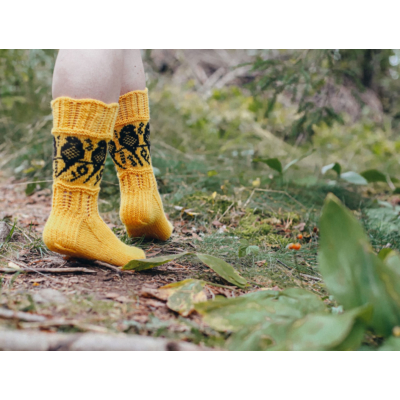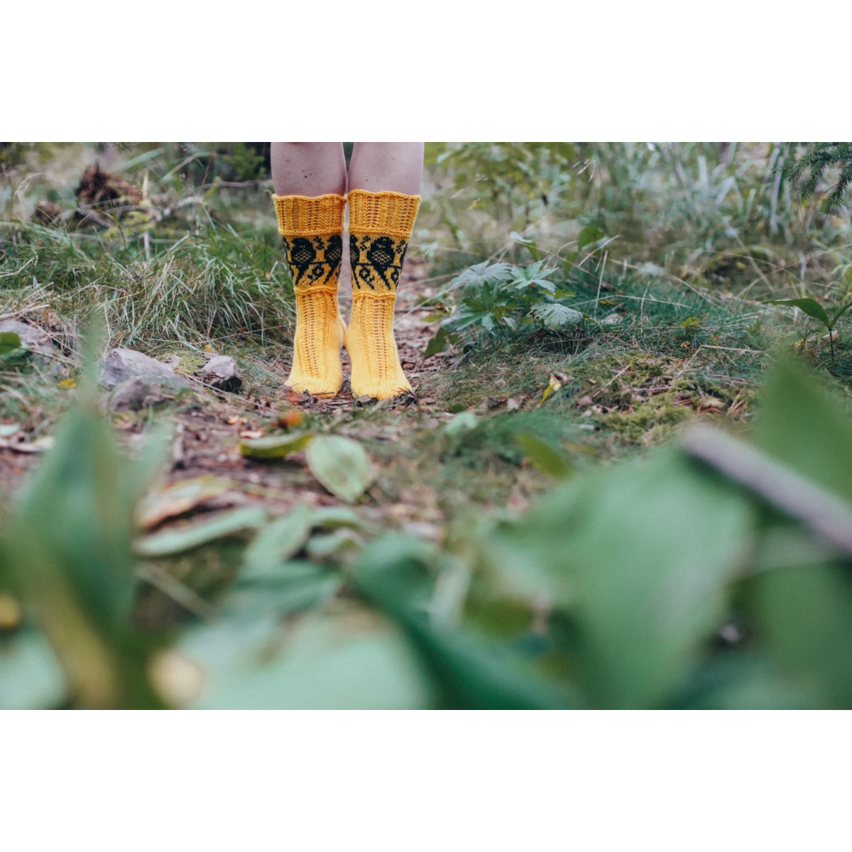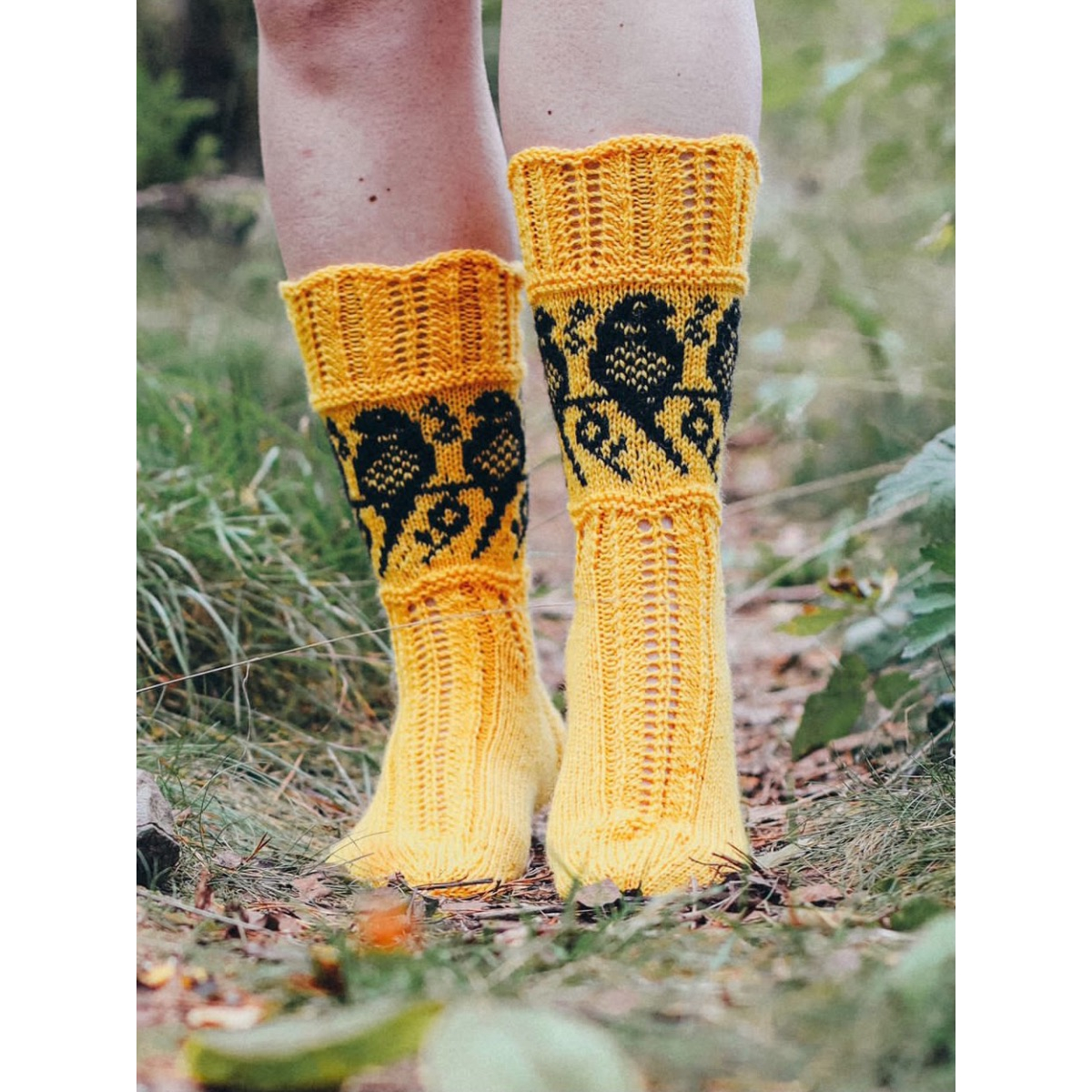 Tsirpit on helppo sukkamalli jossa yhdistyy sekä pitsi- että kirjoneule. Voit neuloa Tsirpit halutessasi myös paksummasta langasta jos tahdot tehdä leveämmät sukat.
